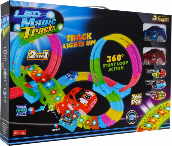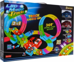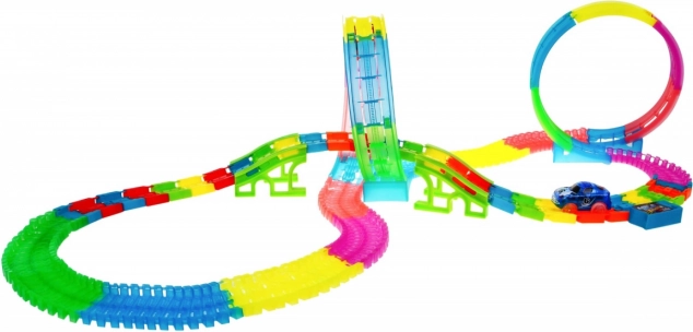 Een leuke en kleurrijke racebaan met loops en verhoogde secties biedt kinderen vanaf 3 jaar urenlang actievol speelplezier. Dankzij fluorescerende onderdelen licht hij op in het donker, heeft hij LED-verlichting, een ingebouwd muziekpaneel en twee LED-autootjes voor spectaculaire ritten met lichtsporen.