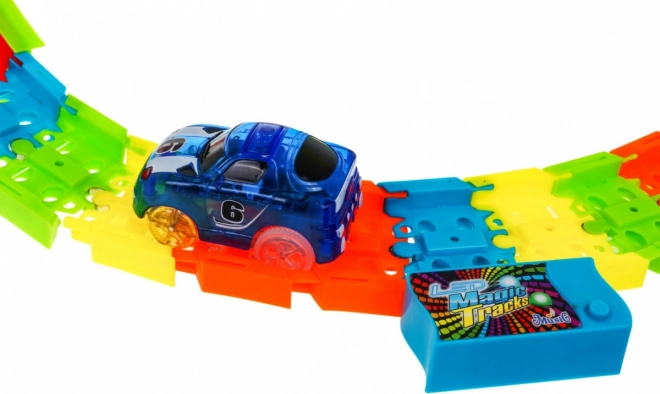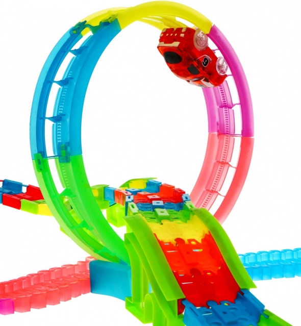De fluorescerende onderdelen lichten op na blootstelling aan licht en de LED-autootjes laten in het donker lichtsporen achter voor maximale beleving.