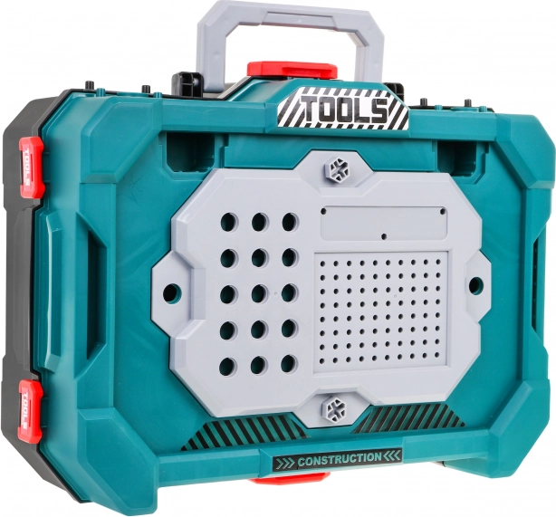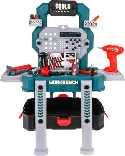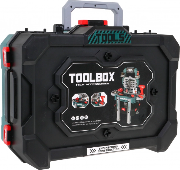 Ontdek de veelzijdige klusset die in een oogwenk verandert van een draagbare koffer in een stabiel werkstation met opbergvakken. Kinderen genieten van de realistische geluiden van de boor-schroevendraaier met twee verwisselbare opzetstukken en oefenen veilig en speels met gereedschap.