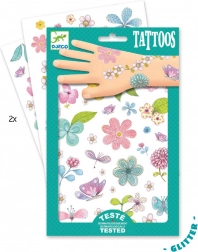 Versier de huid met speelse motieven van het merk Djeco. Deze tijdelijke tatoeages met bloemenmotieven zijn eenvoudig met water aan te brengen, hebben een glinsterend effect, zijn dermatologisch getest en in de verpakking vind je 2 vellen van 21 × 14 cm.