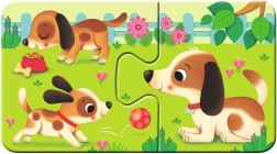 Eerste puzzel voor de allerkleinsten met negen paren dieren en hun jongen. De stukken van extra dik karton zijn makkelijk vast te pakken; het puzzelen stimuleert de fijne motoriek, concentratie en fantasie.