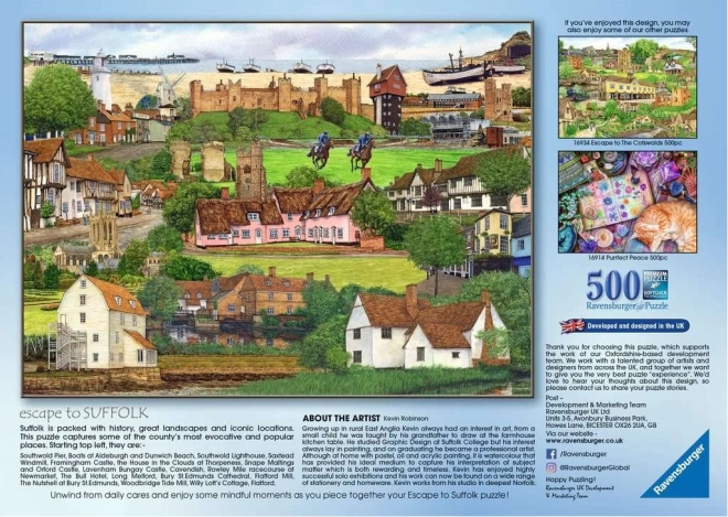 Geniet van ontspanning én een leuke uitdaging met de RAVENSBURGER-puzzel “Vlucht naar Suffolk” met 500 stukjes. Kwalitatieve afwerking, nauwkeurige uitsnijdingen en een prachtig motief voor rustige avonden en concentratietraining.