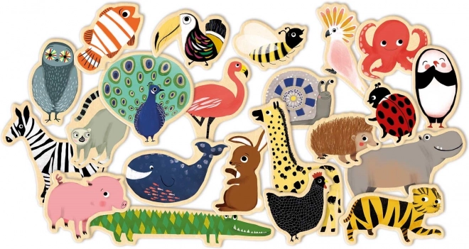 De set houten magneten van DJECO biedt een bonte collectie favoriete dieren – van pauw, giraffe en krokodil tot octopus, nijlpaard, zebra en uil. Kinderen creëren eenvoudig hun eigen dierenwereld, vertellen verhalen en leren vormen en kleuren herkennen.