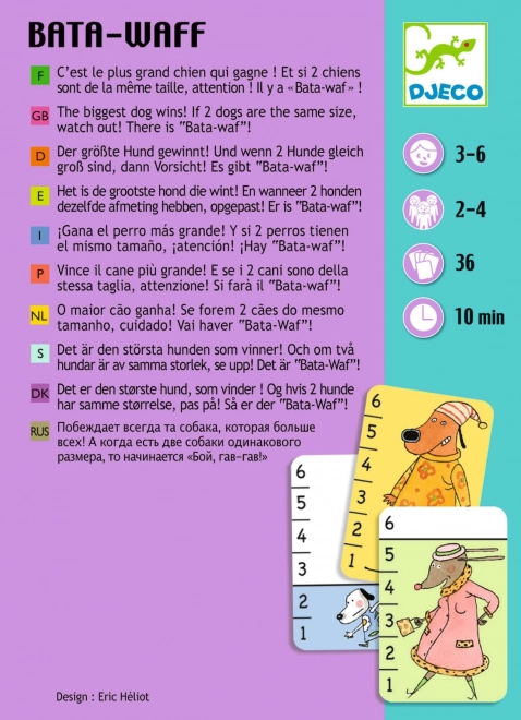 Het spel DJECO Bata-Waf is een pakkend en eenvoudig kaartspel dat kinderen leert maten te vergelijken en tegelijk het reactievermogen traint. Elke speler draait de bovenste kaart om en wie de grotere hond op de kaart heeft, neemt alle opengelegde kaarten. Bij gelijke grootte roepen jullie het magische “Bata Waf” en volgt er een beslissende extra kaart.