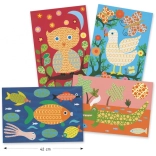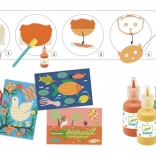 4 afbeeldingen met verschillende achtergronden, 8 vellen met dieronderdelen, 3 flesjes verf (rood, geel, groen), 3 sjabloonstroken, een vel met kleefpuntjes, applicator met sponsje
