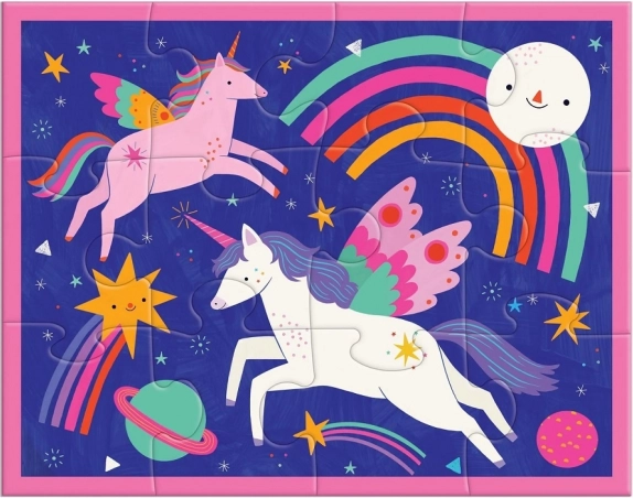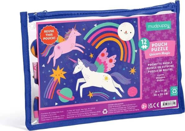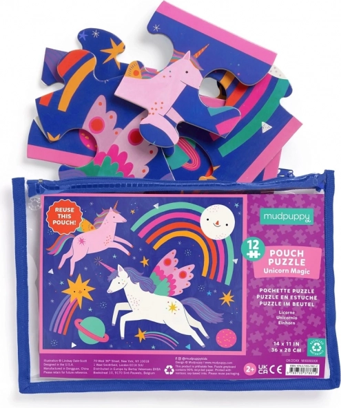 Ontdek de magische wereld van eenhoorns met de puzzel Eenhoorn Magic! Deze legpuzzel bevat 12 extra stevige stukjes, ideaal voor kleine handjes. Het product is verpakt in een herbruikbaar zakje met ritssluiting, wat opbergen en reizen gemakkelijk maakt.
