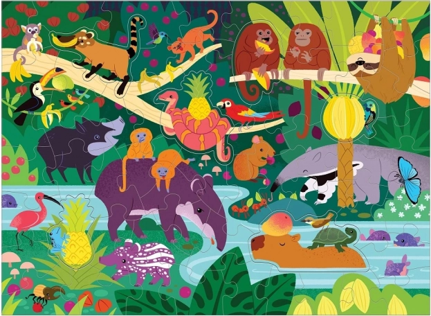 Een levendige jungle met dieren en tropisch fruit prikkelt de aandacht en verbeelding. Ideaal om samen te leggen en spelenderwijs te leren.