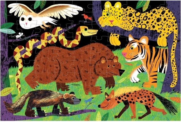 Ontdek leuk en leerzaam puzzelen met de MUDPUPPY-puzzel Roofdieren in het wild, die oplicht in het donker. De set met 100 stukjes biedt een kleurrijke scène van dierlijke jagers, hoogwaardige print met veilige inkten, een matte afwerking voor natuurgetrouwe kleuren en is gemaakt van gerecyclede materialen.