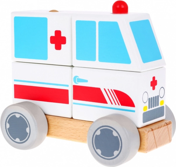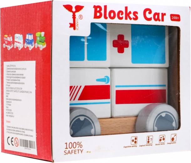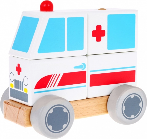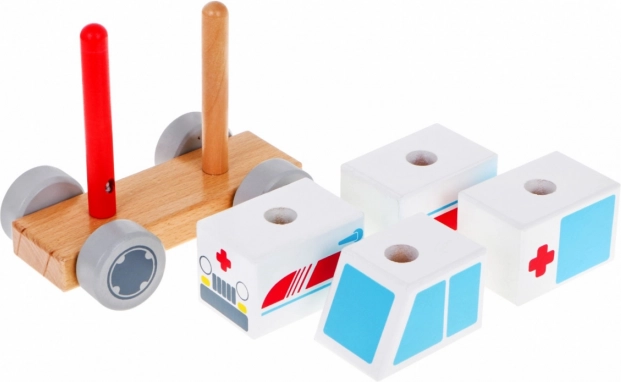 Deze houten ambulance is ideaal voor de eerste bouw- en motoriekspelletjes. Kinderen plaatsen vier blokken op twee pinnetjes in de basis en bouwen zo hun eigen voertuig met herkenbare reddingssymbolen. Veerkrachtige wielen zorgen voor soepel rijden over de vloer en stimuleren verbeelding en thematisch spel als hulpverlener.