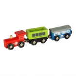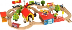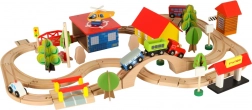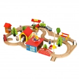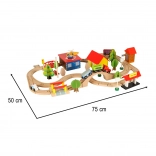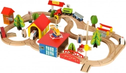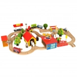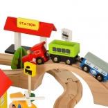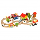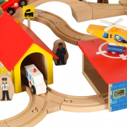 Ontdek onbeperkte mogelijkheden met deze gekleurde houten treinset. De set bevat een station, bruggen, landingsplaats voor een helikopter, figuren en andere elementen om uw eigen dorpje te creëren.