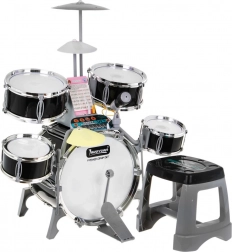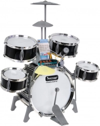 De multifunctionele drumset voor kinderen bevat 5 drums, 2 elektronische bekkens (kunststof) en één metalen bekken, een bedieningspaneel, microfoon, 2 drumstokken en 6 kaartjes met noten voor eenvoudige lesjes. De set wordt gevoed door drie AA-batterijen of via een USB-kabel.