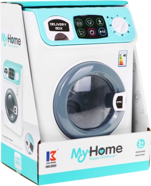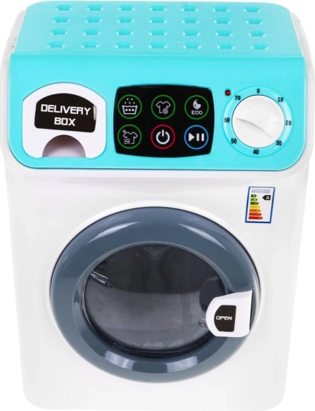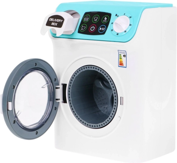 De wasmachine is wit met mintkleurige accenten, heeft een transparant deurtje en realistische knoppen voor een interactieve ervaring.
