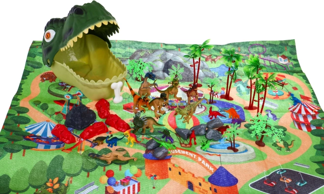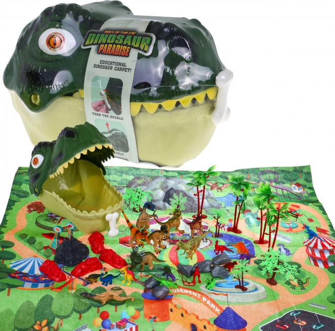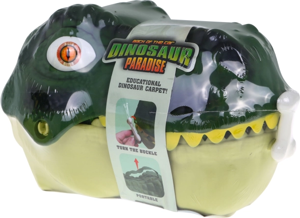 Deze leuke en leerzame set zal alle kleine paleontologen verrukken. De grote plastic dinosauruskop dient als opbergbox met uitschuifbare handgreep, zodat kinderen de hele wereld eenvoudig overal mee naartoe kunnen nemen. Binnenin vind je een vilten speelmat met parkmotief en een bonte collectie rubberen dinosaurusfiguren, bomen, rotsen en een vulkaan voor realistische scènes.