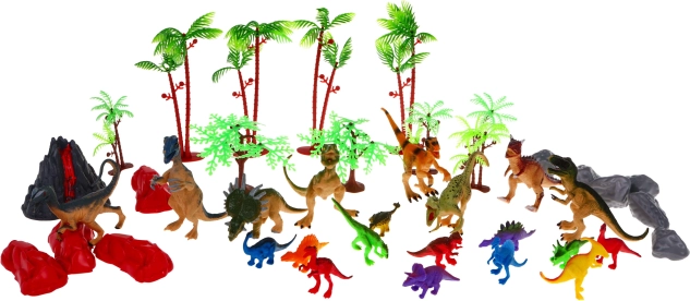 Figuren van verschillende groottes, bomen, rotsen, stenen en een vulkaan maken het mogelijk authentieke prehistorische scènes en verhalen te bouwen.