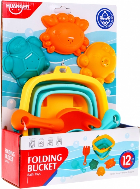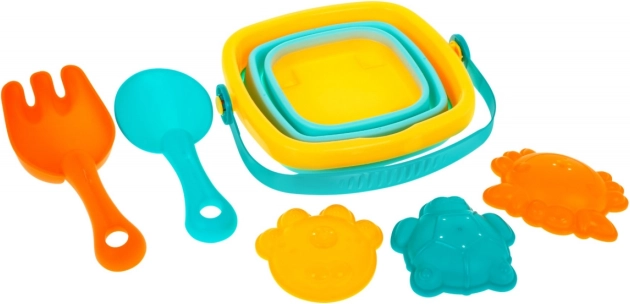 | Afmetingen | - emmer uitgeklapt ca. 18,5 cm x 17,5 cm x 13,5 cm, - emmer ingeklapt ca. 19 cm x 18 cm x 4 cm, - lengte schep en hark ca. 15 cm, - vormpjes ca. 10 cm x 8 cm, - verpakking ca. 29 cm x 22 cm x 7,5 cm. |