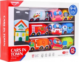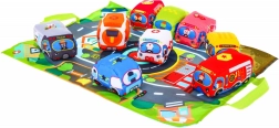 Deze veelzijdige set stimuleert creativiteit en fantasierijk spel bij kinderen vanaf 12 maanden. Negen kleurrijke voertuigen – zoals een schoolbus, brandweerauto, ambulance, taxi, politiewagen, betonmixer, vrachtwagen, ijswagen en donuttruck – nodigen uit om de op de zachte mat gedrukte stad te verkennen.