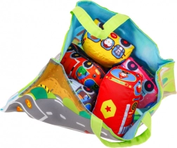 De autootjes zijn gemaakt van zachte stof en dankzij de verschillende geluiden (geritsel, geklingel, gepiep) bevorderen ze de fijne motoriek, het gehoor en de oog-handcoördinatie. De mat vouw je op tot een praktische tas met handvatten voor eenvoudig opbergen en meenemen, ideaal om thuis én onderweg te spelen.