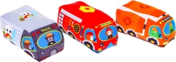 Drie autootjes ritselen, drie klingelen en drie piepen – gevarieerde geluidprikkels stimuleren het gehoor en nieuwsgierig spel.