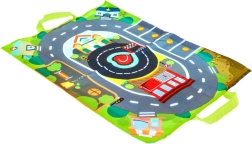 De mat met wegen, huisjes en natuur vouw je dankzij klittenband op tot een praktische tas met handvatten. Makkelijk op te bergen en overal mee naartoe te nemen.