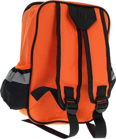 Lichte stoffen rugzak met hoofdvak met ritssluiting, buitenvakken en reflecterende elementen houdt het gereedschap overzichtelijk en veilig op één plek.