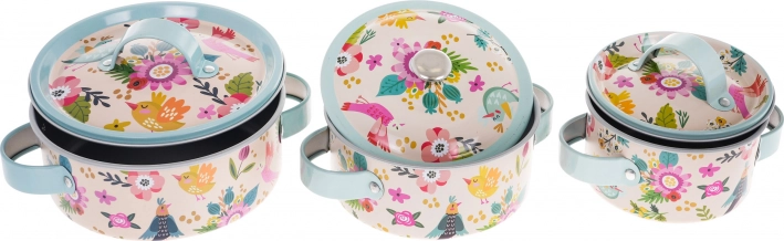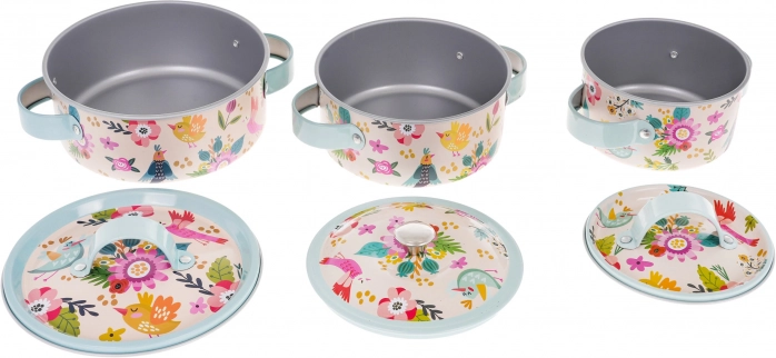 De set bevat drie aluminium pannen met deksels, ideaal voor verschillende kookspelletjes.