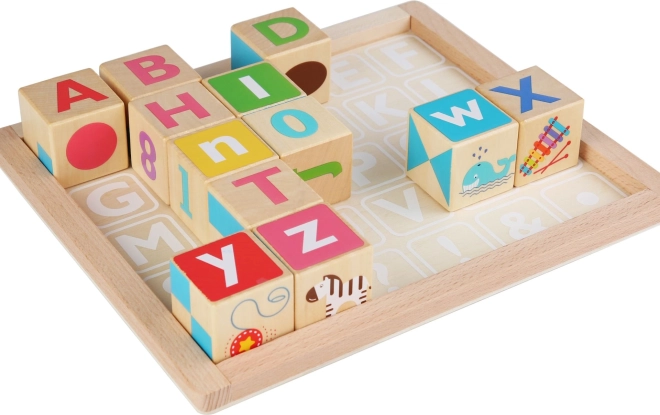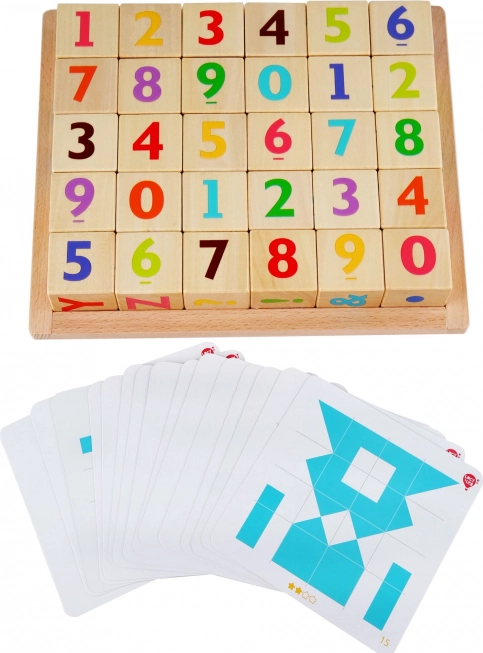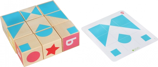 De set bevat ook een kader met het alfabet en 15 dubbelzijdige kaarten met speciale sjablonen. Kinderen kunnen de blokken op de juiste plaats invoegen of vormen maken volgens een patroon dat aan een tangram doet denken. Gemaakt van hoogwaardig hout en geschilderd met niet-giftige verven, zorgt voor veilig en plezierig spel.