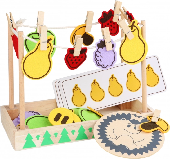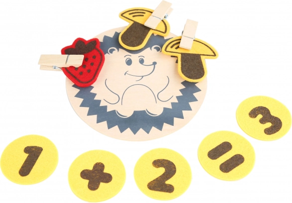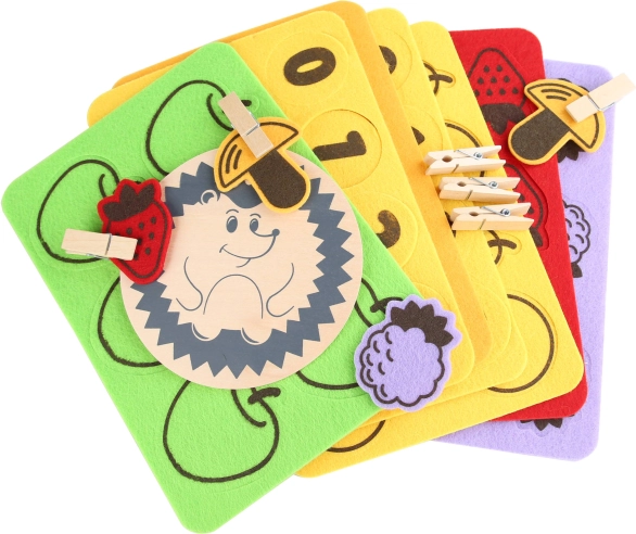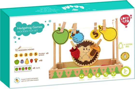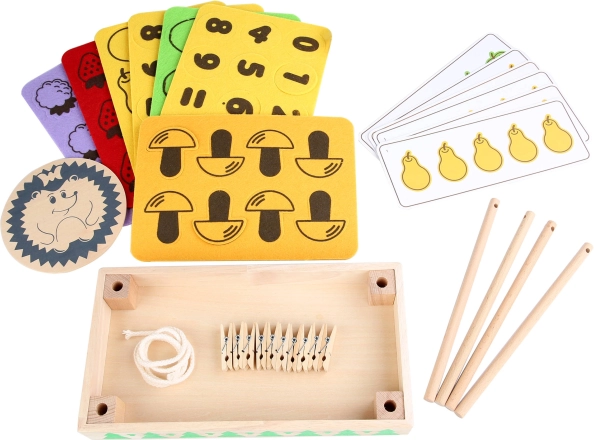 De set omvat een houten basis, een egeltje, leuke kaarten en gekleurde viltmatjes - ideaal ook voor gezamenlijk spelen met meerdere kinderen. Alles is voor eenvoudig opbergen verpakt in een praktische katoenen zak.