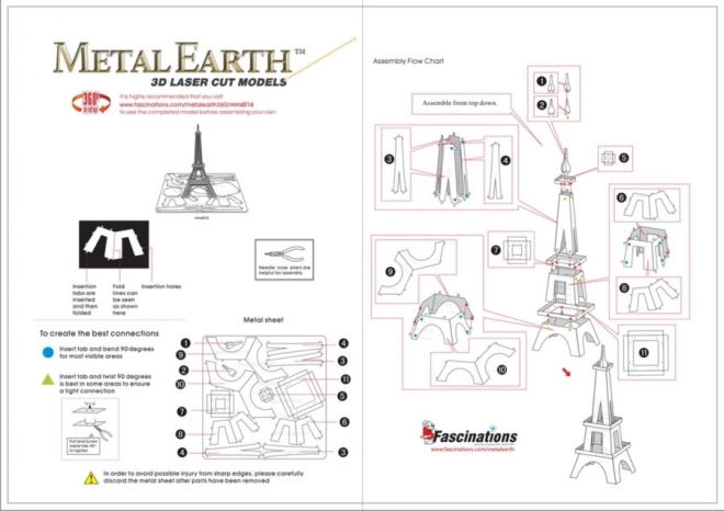 Haal de afzonderlijke onderdelen uit de metalen plaatjes; gebruik indien nodig een kleine zijkniptang (niet inbegrepen). De onderdelen worden met elkaar verbonden via vergrendelingen die bestaan uit een lipje en een opening. Buig het lipje met een kleine, dunne tang (niet inbegrepen) en verbind stap voor stap alle vergrendelingen tot er een zeer realistisch meesterwerk ontstaat!