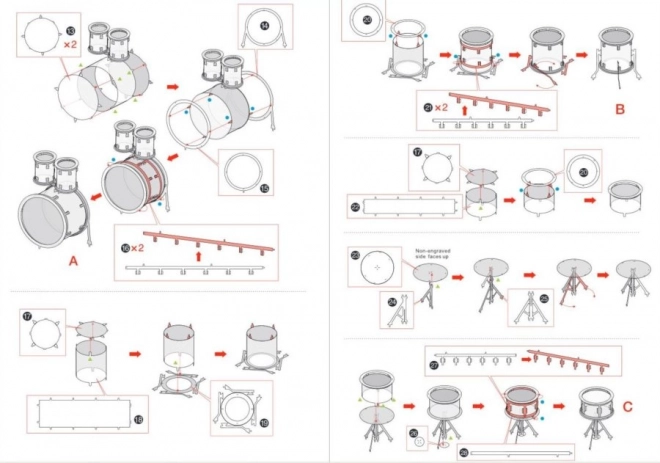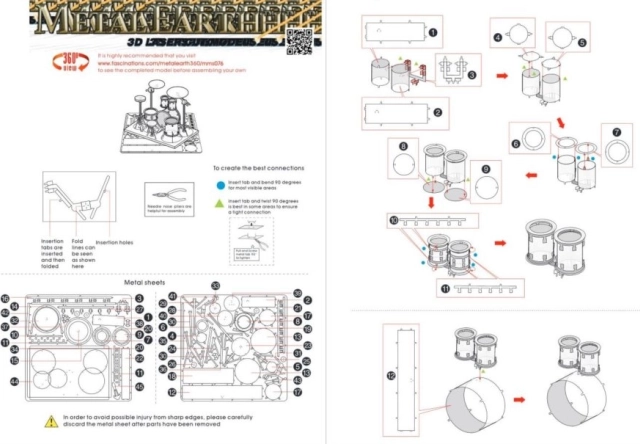 Haal de afzonderlijke onderdelen uit de metalen plaatjes; gebruik indien nodig een kleine zijkniptang (niet inbegrepen). De onderdelen worden met elkaar verbonden via vergrendelingen die bestaan uit een lipje en een opening. Buig het lipje om met kleine, smalle tangetjes (niet inbegrepen) en verbind stap voor stap alle vergrendelingen totdat er een zeer realistisch meesterwerk ontstaat!