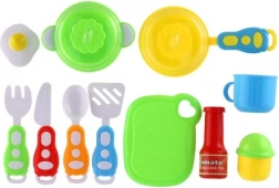Prikkel de fantasie van kinderen met deze kleurrijke set kinderservies van 13 stuks, die alles biedt voor realistisch kookspel. De set bevat een koekenpan en pan met deksel, een snijplank, bestek, een bekertje, een spiegelei, “tomatensaus” en een zoutvaatje. Ideaal voor kinderen vanaf 3 jaar – voor creatief, veilig en leerzaam spel.