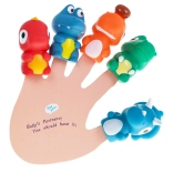 Vijf kleurrijke dino-vingerpopjes van zacht rubber passen perfect op kinderfinger. Ze zijn waterbestendig, zonder scherpe randen en bevorderen de fijne motoriek en creatief spel.