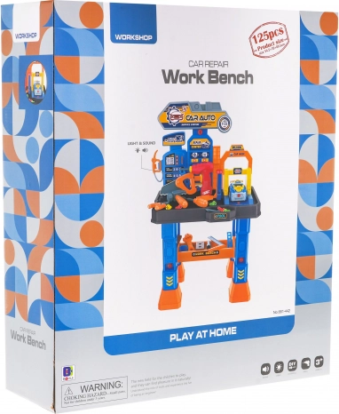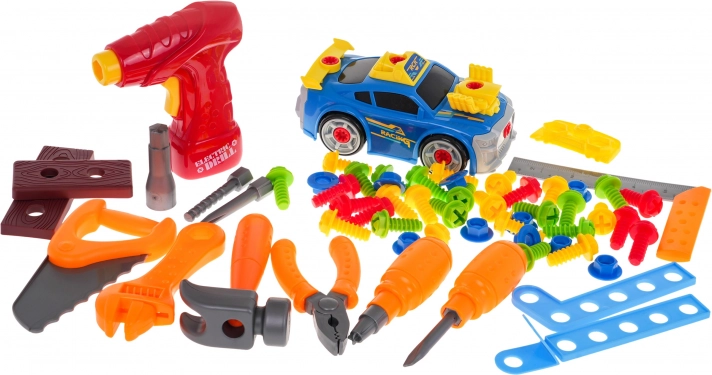De set bevat 125 onderdelen aan accessoires: gereedschap (hamer, zaag, tang, sleutels), een batterijschroevendraaier/boormachine, schroeven, bits, opzetstukken en decoratieve stickers. Het autootje kan worden gedemonteerd en aangepast, wat technisch inzicht en oog-handcoördinatie bevordert. De stabiele werkbank is eenvoudig te monteren en ideaal voor thuis spelen.