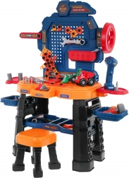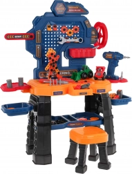 Deze kleurrijke werkplaatsset verandert de kinderkamer in een echte miniwerkplaats. De robuuste werkbank met planken en organizer wordt aangevuld met een comfortabel krukje en een accuboor op batterijen (2× AA, niet inbegrepen). Kinderen kunnen schroeven, boren en hun eigen projecten bouwen, waaronder twee bouwvoertuigen – een shovel en een kiepwagen.