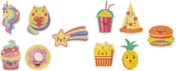 dieren en eten (bijv. eenhoorn, kat, ster, donut, cupcake, pizza, burger, popcorn, drankje, ananas)
