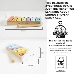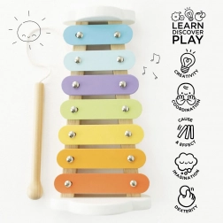 De productie met FSC-gecertificeerd hout en de afwerking met waterverdunbare, niet-giftige verven garanderen veiligheid en duurzaamheid. Spelen met de xylofoon motiveert kinderen om tonen te ontdekken en versterkt de oog-handcoördinatie.