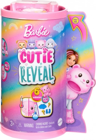 De Barbie Chelsea Cutie Reveal-pop brengt uitpakplezier vol ontdekkingen. In de verpakking vind je een kleine Chelsea-pop verstopt in een pluchen beertjeskostuum, stijlvolle accessoires en een mini-huisdiertje. Het bovenste deel van het kostuum kan na omkeren veranderen in een donzige jas en de kostuumkop wordt een mandje voor het huisdiertje.
