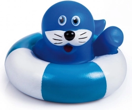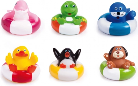 Een vrolijke groep diertjes op drijvende ringetjes zorgt voor veel plezier in bad of in een klein zwembadje. Elk diertje heeft een compact formaat voor kinderhandjes, zachte, gladde vormen en opvallende kleuren die de aandacht trekken en aanzetten tot ontdekken. De speelgoedjes drijven vrij op het water, ideaal voor de eerste waterspelletjes en het oefenen van de grijpreflex.