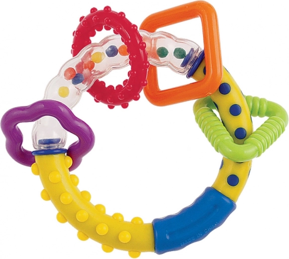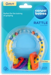 Lichte en veilige rammelaar met ringen van Canpol babies die baby’s plezier geeft met zijn intensieve kleuren, aantrekkelijke vormen en aangenaam geluid. Ondersteunt de ontwikkeling van zicht, gehoor en fijne motoriek en is gemaakt van veilige materialen zonder scherpe randen.
