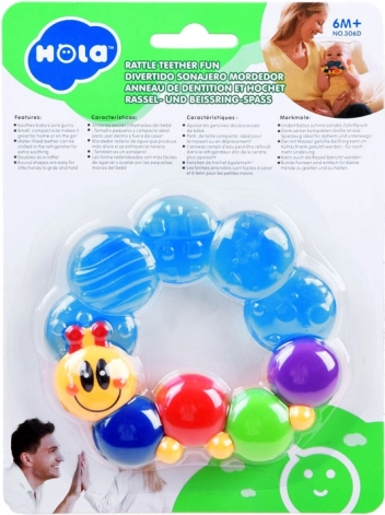 De schattige HOLA-bijtring in de vorm van een rups is gemaakt van duurzame en veilige materialen voor dagelijks gebruik. Dankzij de lichte constructie en slimme vorm kan het kind hem gemakkelijk vastpakken en van het ene handje naar het andere overbrengen. De getextureerde segmenten masseren het gevoelige tandvlees doeltreffend en helpen het ongemak tijdens het doorkomen van de eerste tandjes te verzachten.