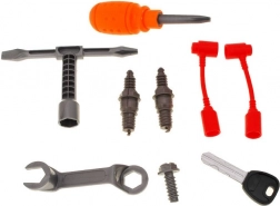 De set bevat kindergereedschap: een kruiskopschroevendraaier, een 3-in-1 sleutel (dopsleutel + platkop + kruiskop), een 2-in-1 sleutel (platkop + ringsleutel) en andere accessoires. Kinderen oefenen basismechanische handelingen op een veilige manier.
