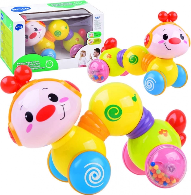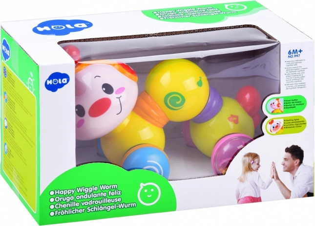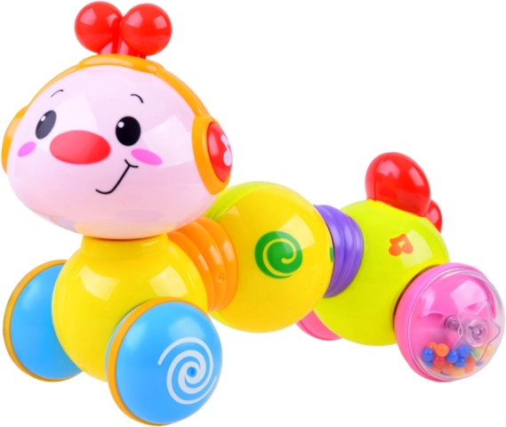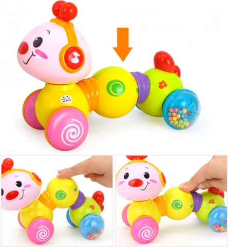 De interactieve rijdende rups Happy Wiggle Worm is het ideale speelgoed voor baby’s en peuters. Na een druk op de rug spant de rups zich en rijdt hij vooruit over een vlak oppervlak, terwijl de kop van kleur verandert en aangename melodieën klinken. De draaibare kop stimuleert nieuwsgierigheid en de fijne motoriek.