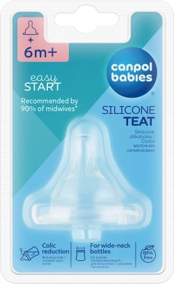 Antikolieks, siliconen speen voor flessen met brede hals zorgt voor een zeer goede ontluchting en minimaliseert zo het ontstaan van babykoliek. Ondersteunt de juiste ontwikkeling van beet, spraak en tandvlees van het kind. Door zijn vorm doet hij denken aan de tepel van de moeder en maakt hij het mogelijk flesvoeding te combineren met borstvoeding. Gemaakt van hoogwaardige siliconen, volledig smaak- en reukloos en verandert de smaak van het aangeboden voedsel niet. Verkrijgbaar in zes doorstroomsnelheden. Houd bij het kiezen van de speenmaat rekening met de leeftijd van het kind, zijn eetlust en het type aangeboden voeding. In de verpakking 1 stuk.Gebruiksaanwijzing voor de speen:Voor eerste gebruik om hygiënische redenen 5 minuten in kokend water steriliseren. Reinig voor elk gebruik. Reinig na gebruik voedselresten, spoel, was en steriliseer vervolgens in een stoom-/elektrische sterilisator of in kokend water. We raden af om de speen in de vaatwasser te wassen, omdat gebruikte middelen het product kunnen beschadigen. Gebruik geen chemische desinfectiemiddelen! Controleer de staat van de speen voor elk gebruik. Besteed extra aandacht zodra de eerste tandjes doorbreken. Test de kwaliteit door de speen grondig in alle richtingen uit te rekken. Bij de eerste tekenen van beschadiging de speen onmiddellijk weggooien en niet meer gebruiken. Draai de dop met speen niet te strak vast – anders kan de speen niet correct ontluchten. Controleer of de voeding niet onder het schroefdeksel door lekt. Prik geen gaten in de speen en vergroot deze niet – dit kan tot beschadiging leiden. Laat de speen niet in direct zonlicht, in de buurt van een warmtebron of langer dan aanbevolen in steriliserende middelen liggen; dit kan verzwakking veroorzaken. Om hygiënische en veiligheidsredenen raden we aan de speen na 2 maanden te vervangen. Vruchtensappen en thee kunnen verkleuring veroorzaken, wat de eigenschappen echter niet beïnvloedt.Waarschuwing! Belangrijk voor de gezondheid en veiligheid van uw kind!Alleen gebruiken onder direct toezicht van een volwassene. Gebruik de speen nooit als fopspeen. Langdurig of herhaald zuigen van vloeistoffen kan tandglazuurschade bij het kind veroorzaken. Controleer altijd de temperatuur van de voeding. Dit product is geen speelgoed. Buiten bereik van kinderen bewaren.De speen voldoet aan de eisen van:Verordening (EG) nr. 1935/2004 van het Europees Parlement en de Raad – algemene eisen voor materialen en voorwerpen bestemd om met levensmiddelen in contact te komen,EN 14350-1 Producten voor de verzorging van kinderen – Drinkuitrusting – Deel 1: Algemene en mechanische eisen en beproevingen,EN 14350-2 Producten voor de verzorging van kinderen – Drinkuitrusting – Deel 2: Chemische eisen en beproevingen.
