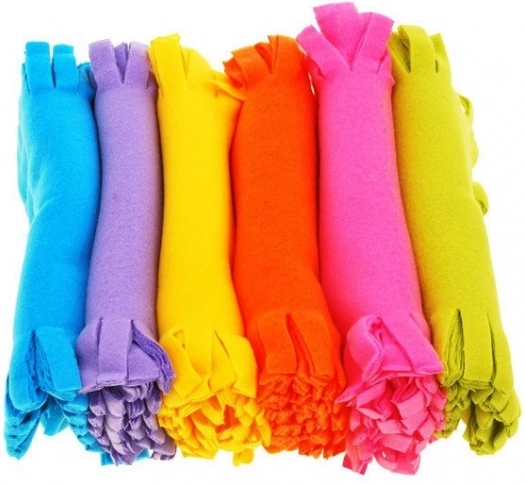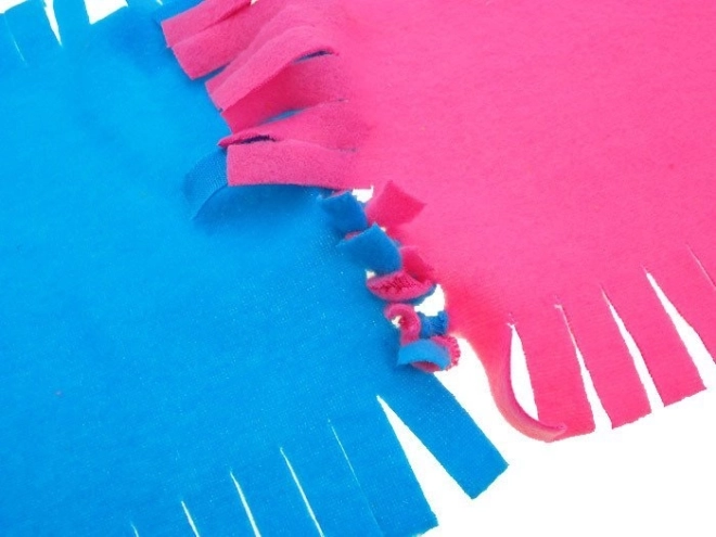 Elk stuk heeft voorbereide franjes – je hoeft de vierkanten alleen maar aan elkaar te knopen en de deken is klaar, zonder naald en draad. Ideaal ook voor beginners.