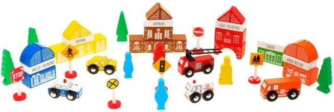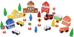 De blokken hebben een aangename textuur en zijn van een passende grootte voor kleine kinderhanden. Voorbeelden van groottes: gebouwen (ongeveer 3cm x 6cm x 3cm), ambulance (3,5cm x 5cm x 3cm), brandweerwagen (5,5cm x 8,5cm x 3cm), politie (4cm x 6cm x 3cm), figuurtjes (5cm x 2,5cm x 1cm), verkeersborden (hoogte 7cm) gemaakt van plastic.