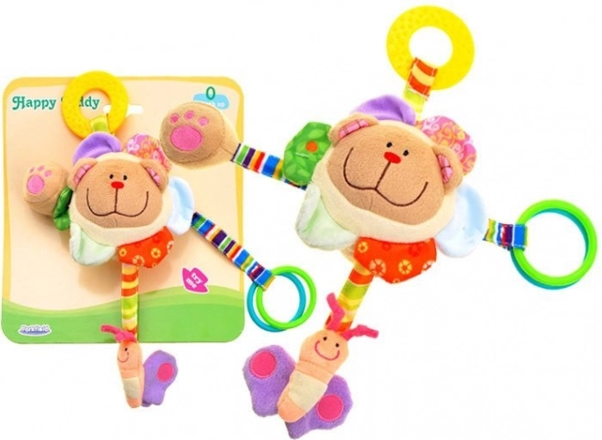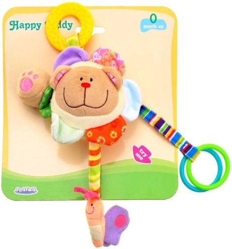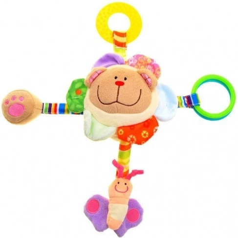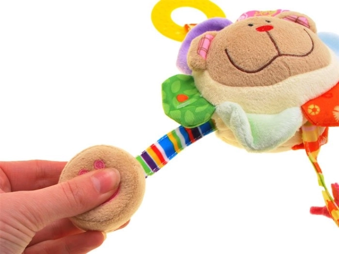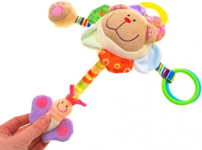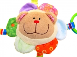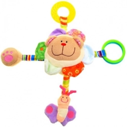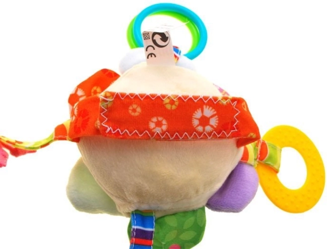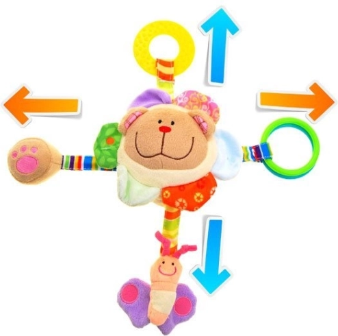 In het hoofdje zit een rammelballetje dat bij het schudden een zacht geluid maakt – ideaal om de aandacht te trekken en beweging te stimuleren. Het speeltje heeft vier kleurrijke linten met verschillende speelelementen: