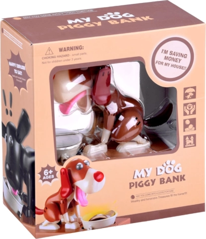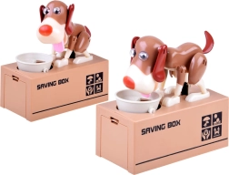 Je gooit een munt in het bakje voor de hond. De hond begint te bewegen alsof hij uit het bakje eet, waardoor de munt in de spaarpot valt. De hond beweegt vrolijk en schudt met zijn oren. Voor gebruik heb je 3 batterijen nodig. De spaarpot helpt kinderen te begrijpen dat sparen niet alleen leuk is, maar ook positieve resultaten oplevert.