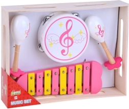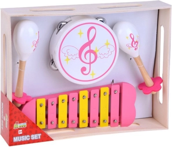 Deze meerledige muzieksset is een perfecte keuze voor kleine muzikanten en een hele groep vriendjes. De instrumenten zijn gemaakt van hoogwaardig hout, hebben een aangename klank en een aantrekkelijk design in roze en gele tinten. Kinderen ontwikkelen er spelenderwijs ritme, coördinatie en muzikaal gevoel mee.