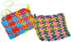 De afgewerkte creaties dienen als onderzetters, pannenlappen of kleine tasjes. Dankzij de mix van kleuren zien ze er fraai uit en zijn ze leuk als handgemaakt cadeautje.