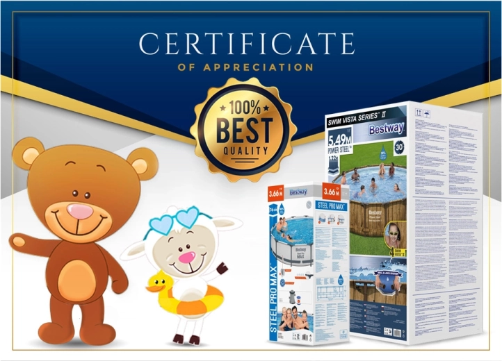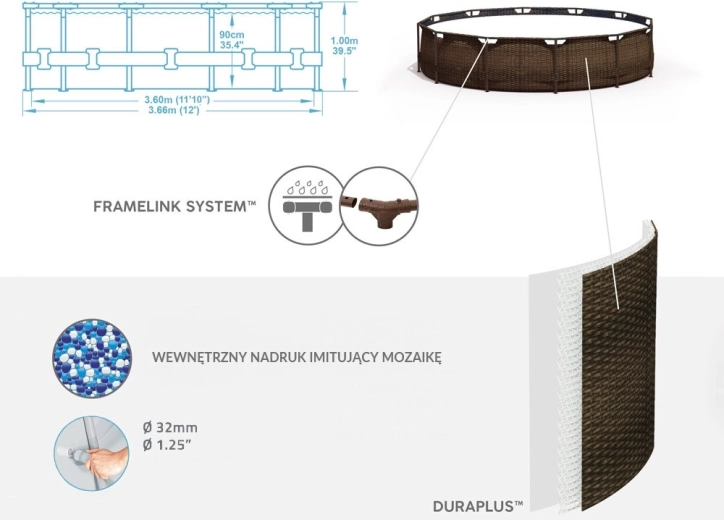 De bodem van het zwembad is gemaakt van het sterke DuraPlus™-materiaal. Dit materiaal heeft een polyester gaaskern die is verbonden met twee lagen stevig PVC. Het biedt maximale duurzaamheid en is onder meer bestand tegen chloor en zonlicht. Het speciale metalen frame is bestand tegen regen en wisselende weersomstandigheden. Dankzij speciale connectoren, het FrameLink System™, is het frame beschermd tegen corrosie op de plek waar metaal op metaal aansluit.