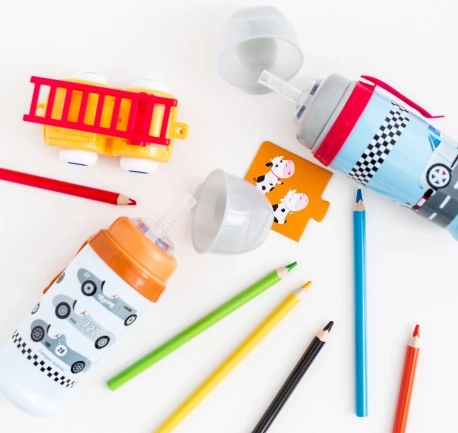 Praktische kleurrijke fles met een siliconen lekvrij rietje, bedoeld voor kinderen ouder dan 12 maanden die al zelf kunnen drinken. Ideaal voor reizen of wandelingen. Het zachte siliconen rietje is veilig voor gevoelige kindertandvlees. Het membraan in het rietje voorkomt dat vloeistof eruit loopt wanneer de fles ondersteboven wordt gedragen of wordt laten vallen. Vloeistof stroomt alleen wanneer het kind aan het rietje zuigt. De doorstroming hangt af van de zuigkracht van het kind. Het siliconen rietje is verbonden met een plastic rietje dat tot op de bodem van de fles reikt en het leegdrinken vergemakkelijkt. Het rietje is niet bedoeld voor kinderen jonger dan 6 maanden. De fles is gemaakt van veilig, duurzaam materiaal dat bestand is tegen beschadiging. De dop beschermt het drinktuitje tegen vuil. De clip maakt het mogelijk de fles aan een kinderwagen of riem te bevestigen. Inhoud 350 ml. De fles is BPA-vrij.Vervangende rietjes vindt u onder nummer 56/005 in de sectie spenen en drinktuiten.Gebruiksaanwijzing. Houd schoon. Was vóór het eerste gebruik en voor elk volgend gebruik alle gedemonteerde onderdelen (fles, schroefdop, plastic rietje, siliconen rietje, clip, kap) in warm water met een mild afwasmiddel en spoel grondig met heet water. Niet uitkoken. Dikke vloeistoffen (bijv. sappen met stukjes fruit) kunnen de openingen in het ventiel verstoppen.Let op! Belangrijk voor de veiligheid en gezondheid van uw kind! Gebruik alleen onder direct toezicht van een volwassene. Langdurig en vaak zuigen aan vloeistoffen kan tandglazuurschade bij het kind veroorzaken. Controleer altijd de temperatuur van het aan het kind gegeven voedsel. Controleer het product vóór elk gebruik. Gebruik het product niet meer bij de eerste tekenen van slijtage of beschadiging – vervang het door een nieuw exemplaar. Het rietje is niet bedoeld voor kinderen jonger dan 6 maanden. Waarschuwing! Dit product is geen speelgoed. Bewaar alle onderdelen buiten het bereik van kinderen.De fles voldoet aan de eisen van:Verordening (EG) nr. 1935/2004 van het Europees Parlement en de Raad – algemene eisen voor materialen en voorwerpen bestemd om met levensmiddelen in contact te komen,Verordening (EU) nr. 10/2011 van de Commissie inzake materialen en voorwerpen van plastic bestemd om met levensmiddelen in contact te komen,EN 14350-1 Producten voor de verzorging van kinderen – Drinkuitrusting – Deel 1: Algemene en mechanische eisen en beproevingen,EN 14350-2 Producten voor de verzorging van kinderen – Drinkuitrusting – Deel 2: Chemische eisen en beproevingen.